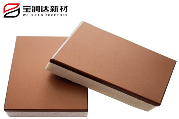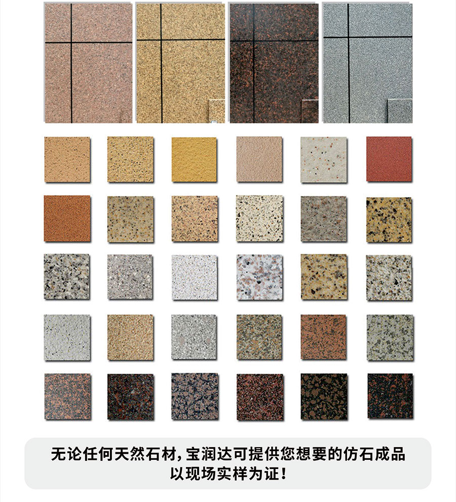 寶潤達一體板飾面層采用真石漆,多彩漆,水包水,水包砂,乳膠漆,實色/金屬氟碳超3000種顏色定制,可根據石材定做樣品