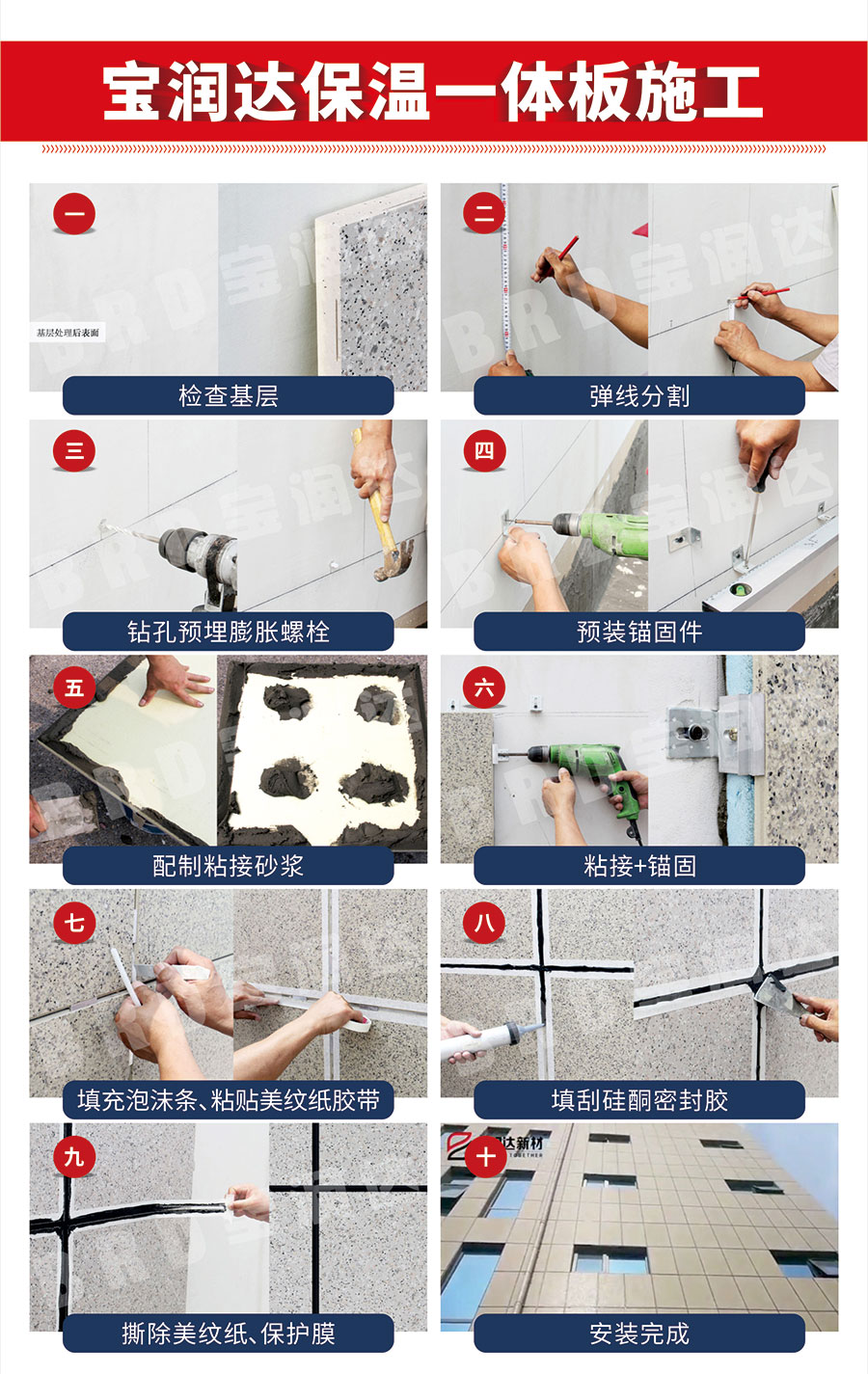 寶潤達在保溫裝飾一體板領域的優勢,不僅僅只是建立在現代化的生產車間、先進的制造工藝、卓越的產品性能上。寶潤達自1995年涉足外墻裝飾領域以來,積累了24年的行業經驗,擁有一支行業高水準的設計、安裝施工隊伍,真正具備集產品、設計、施工為一體,打造精品工程的能力。只要您給寶潤達參與的機會,我們就有十足的信心向您提供放心的系統化解決方案。寶潤達外墻保溫裝飾一體板(干掛)施工安裝工藝